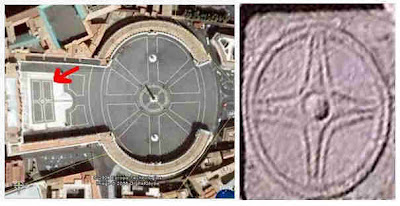 Abaixo a esquerda a praça São Pedro em Roma e a direita o símbolo de baal