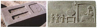 Acima temos uma coluna do deus pagão Baal, também adorado como sendo o deus Sol. Esta coluna foi encontrada na cidade Cananita, Hazor, no norte de Israel, datada de 1300 anos antes da época de Cristo. Ao seu lado vemos a representação de Shamassh um outro deus Sol adorado pelos Babilônicos.