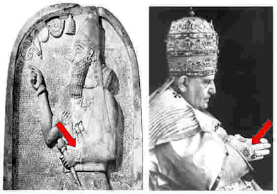Não é diferente nos exemplos que mostraremos a seguir, onde a aliança entre o Catolicismo e o paganismo chega a ser inegável. Temos uma escultura do rei assírio Ashurnasirpal II (883-859 a.C) onde encontramos outra vez a imagem da cruz maltesa no peito. Ele esta apontando para o Sol que demonstra toda a sua adoração ao falso deus sol shamash. Podemos perceber a imagem do Sol em seu pulso. Ao seu lado vemos uma foto do papa João XXIII, curiosamente portando os mesmos símbolos em suas vestimentas e exatamente no mesmo lugar.